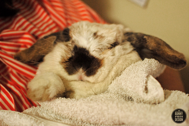 After a bunny bath, we turn up the dehumidifier and Tofu gets wrapped up in fresh towels (also known as a bunny burrito)  and held like a baby.