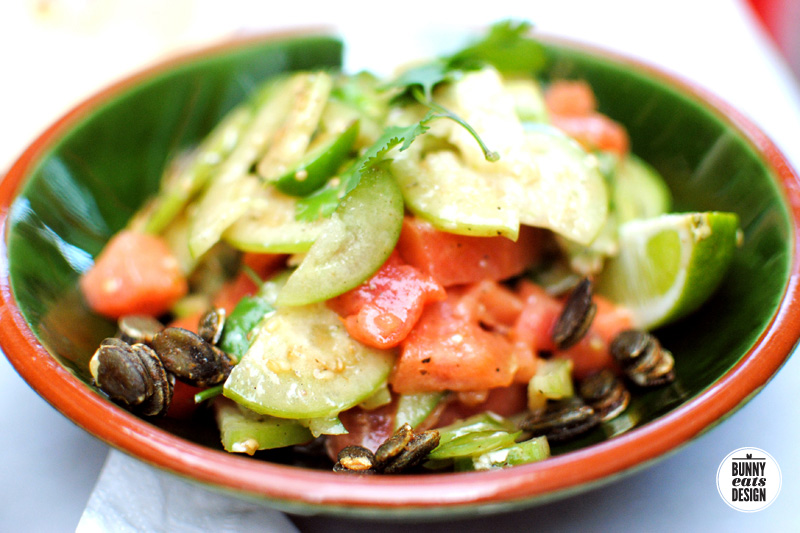 Lots of small tasty snacks to be shared. Fresh food with bright flavours.
