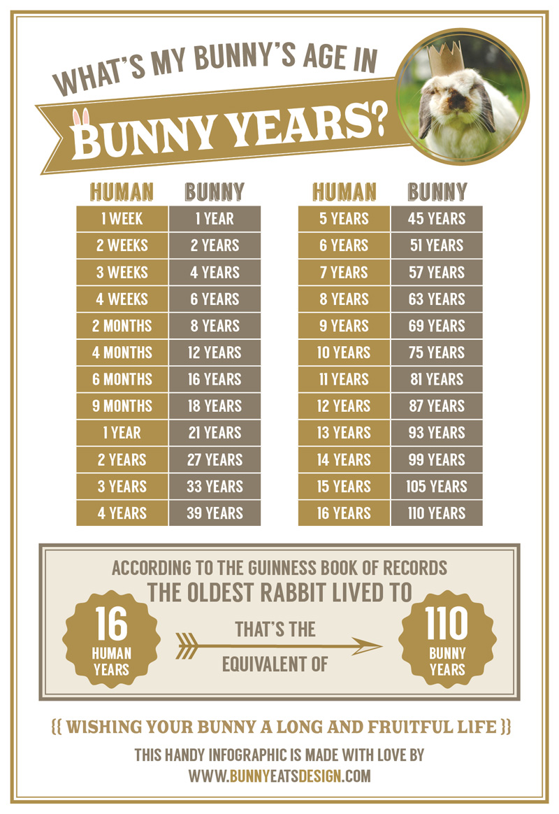 This might seem like a strange way to present bunny ages, but you should neuter (or spay) rabbits from 3-4 months old and in bunny years, that’s roughly when they reach puberty at 10-12 years old. Waiting until a rabbit is 1 year old (or 21 bunny years old) before neutering (or spaying) would be irresponsible.