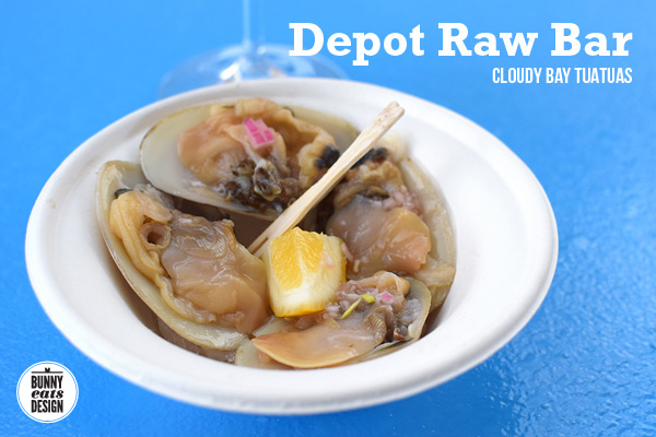 Depot’s Raw Bar was a cool set up. The menu was Oysters, Bloody Mary Oyster Shooters and Tuatuas (clams). When we arrived, the chefs were standing around, proud as punch and with nothing to do. All the hard work already done. Smart move!