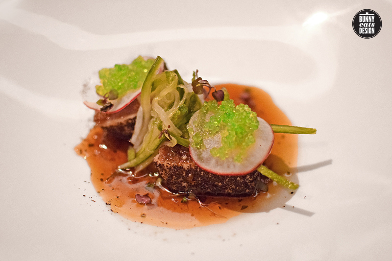 Tea-dusted seared Tuna with umeboshi (pickled plum), miso and cucumber was served with a sweet Riesling. This was a contrast match. The tuna was an umami hit (savour) with miso and pickled plum sauce compared to the sweet wine. The chef, Eiji Ota is Japanese and this dish is beautifully inspired by Japanese cuisine. one-tree-grill006