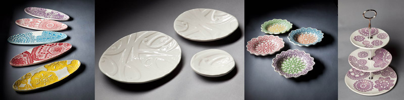 Ceramic art including tiered cake stands, bowls, plates and platters.