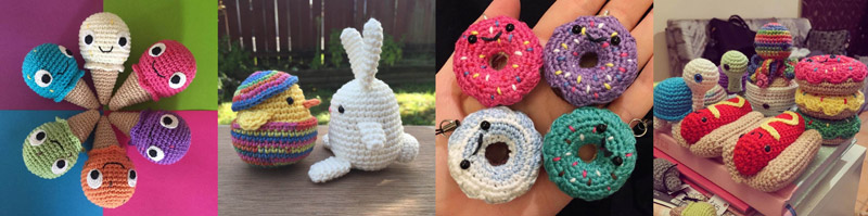 Crocheted cuties including hot dogs, burgers, easter eggs, fruit and vege.