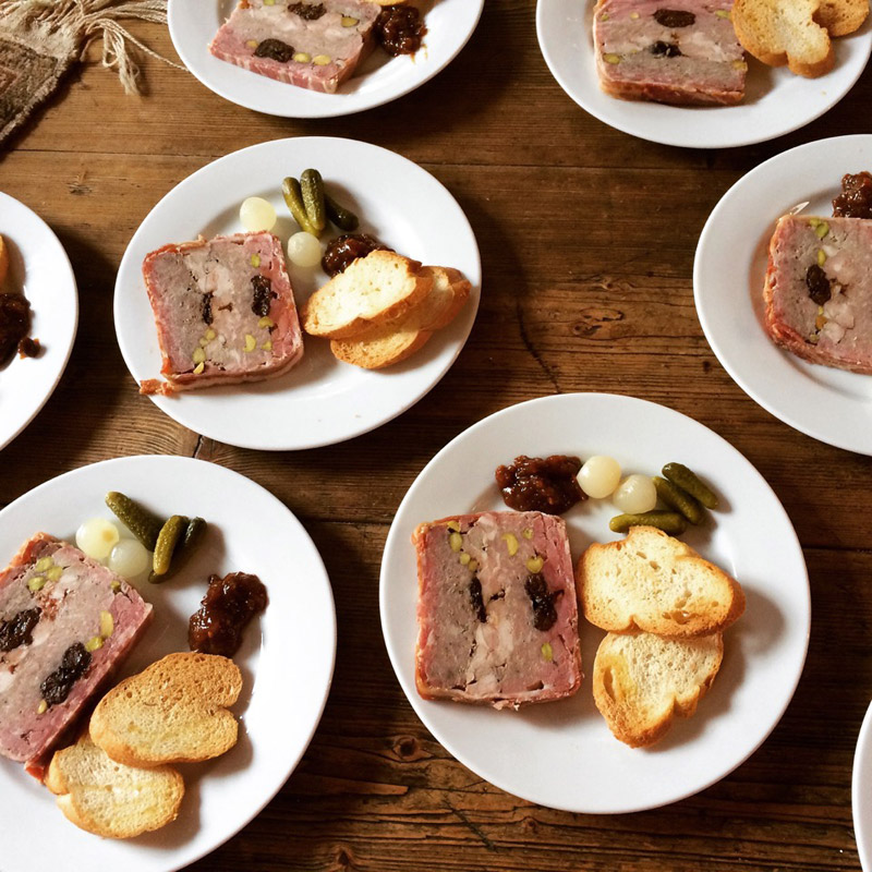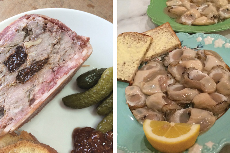 Homemade pork terrine with pickles and chutney. And some oysters.
