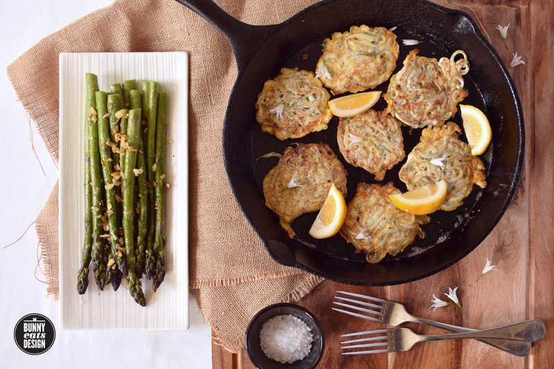 Fritters served with lemon, asparagus and a pale ale, this is a spring time lunch fit for kings and queens. Dig in with your hands or use a fork if you’re trying to impress. My forks were only for show. We’ve been loving Moa Session Pale Ale with it’s bitter and fruit notes taste like summer. A great match with these fritters.