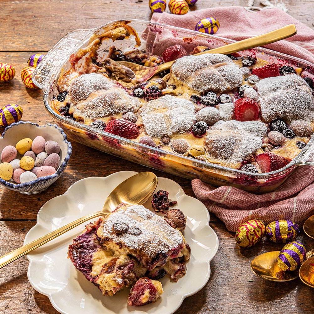 Hot Cross Bun Pudding with Berry Yoghurt Custard