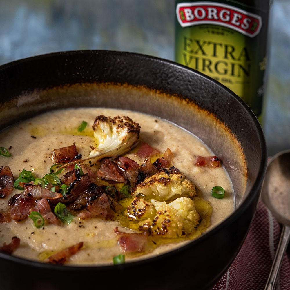 A hearty soup with option of bacon and fresh herbs. Cauliflowers are in season right now and perfect for cold nights. Roasting cauliflower in a little extra virgin olive oil brings out all the sweet flavour. Reserve a roasted floret for garnish.