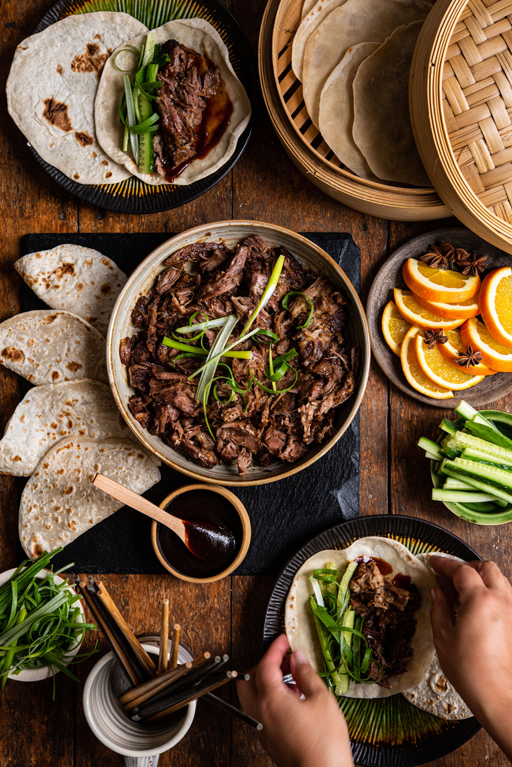 8. Serve lamb with warmed Peking pancakes, spring onion, cucumber and hoisin sauce. To assemble a pancake, take a heaped tablespoon of lamb and dip in hoisin sauce. Place into the centre of a pancake, spreading the sauce on the pancake using the lamb. Add cucumber and spring onion. Fold or roll up and eat.