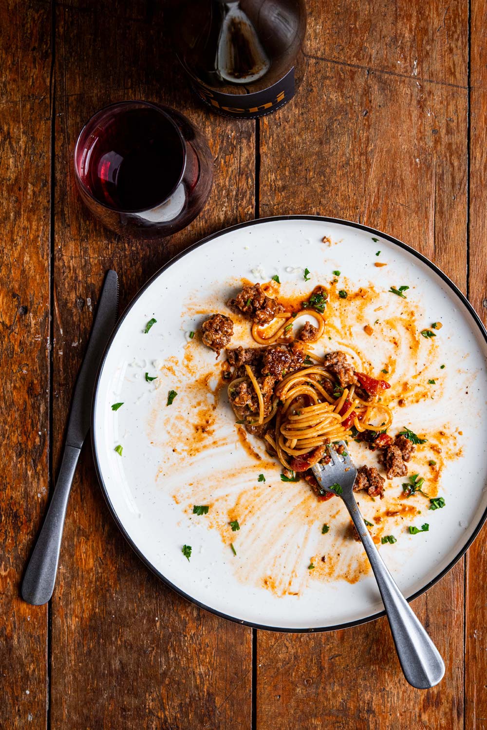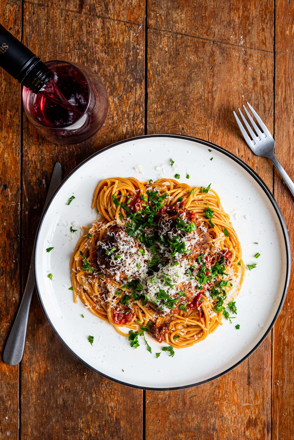 When it comes to spaghetti and meatballs, I’m a fan of chonky meatballs. These meatballs are egg size and weigh just over 70 grams each. You can use a ¼ cup measuring cup to scoop but I just eyeball it.