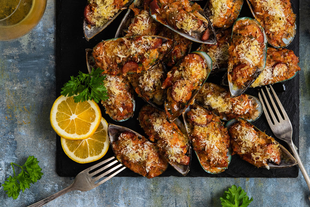 - Place a couple of pieces of chorizo on each mussel and press a spoonful of cheesy topping on top of each mussel to fill the shell so the topping is flush. Sprinkle with panko bread crumbs and freshly ground black pepper. Drizzle with extra virgin olive oil. Bake for 10 minutes at 220°C until golden.