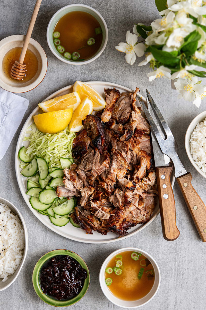 Looking for a hands-off dinner? This honey miso slow roast pork shoulder is quick to put together but then spends 3 hours in the oven. Served with shredded cabbage, sliced cucumber, rice, and miso soup for a delicious, not too heavy spring dinner. Get this started early and enjoy your meal outside while it’s still light!